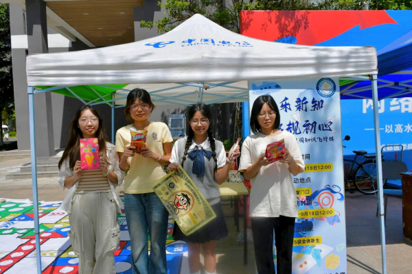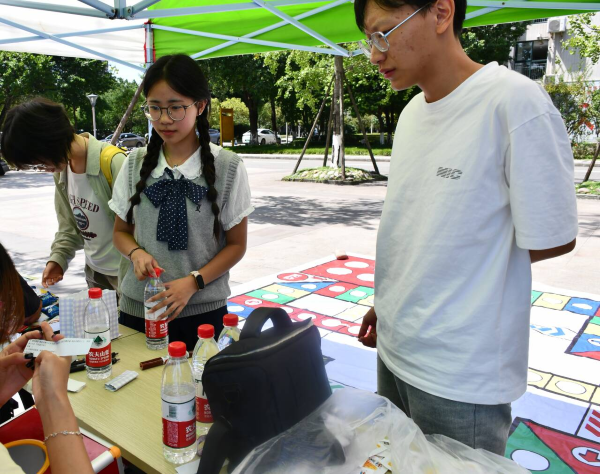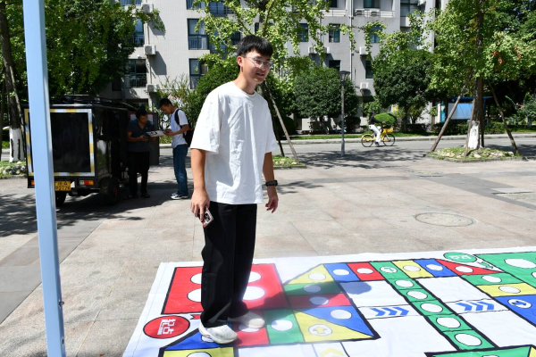 活动创新地将校史精华、《学生手册》核心规则融入掷骰子、走棋格的趣味挑战中,设置校史问答、校规知识等多种类型的题目,涵盖学校发展历程、校园管理规范、学风建设等多个方面。活动当天,食堂门口热闹非凡。巨型飞行棋棋盘上,新生们以小组为单位,兴致勃勃地掷骰子、走棋格、答题目。“掷出6点啦!前进6格,回答‘学校校训的内涵是什么’……”大家或因答对题目而欢呼,或因趣味问答而引发对校史校规的深入讨论,在游戏中沉浸式学习,让校史故事“活”起来,让规章制度“动”起来。