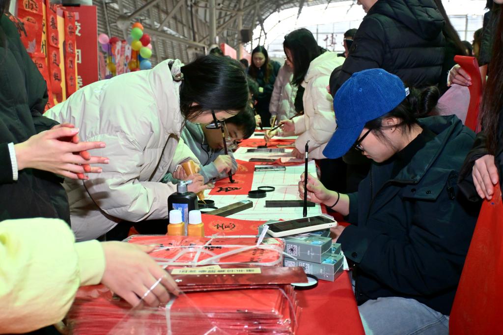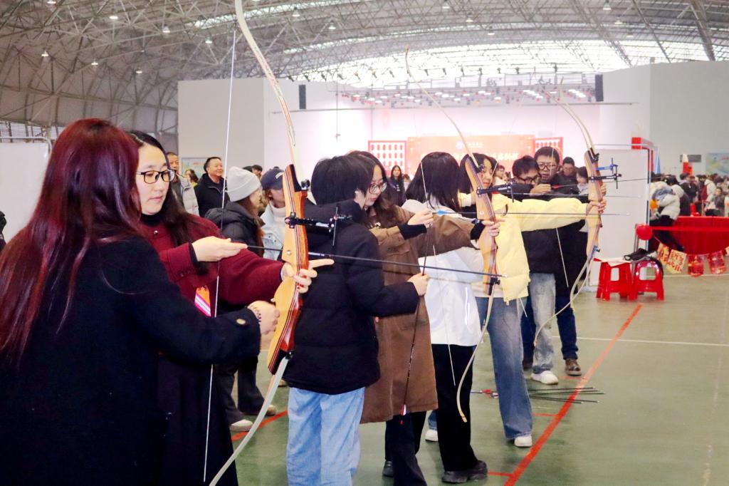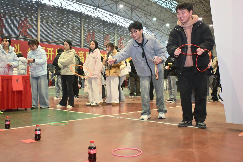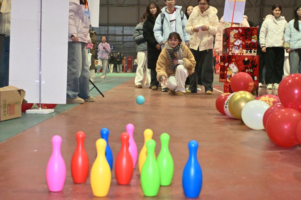 本次游园会由学校党委主办,相关职能部门和各二级党组织共同承办,在蜂巢体育馆内精心设置了16个特色活动站点。“袋鼠跳跳跳”“你画我猜”“套大鹅”“蒙眼敲鼓”等20余项融合传统民俗与现代趣味的游园项目,吸引了师生们的踊跃参与。现场人潮涌动,掌声与欢笑交织,射箭、套圈、猜谜等项目前排起长龙,制作棉花糖、拓印福字、写春联的体验区火热“出圈”,清脆的“吹爆气球”声宛如鞭炮,更添喜庆。