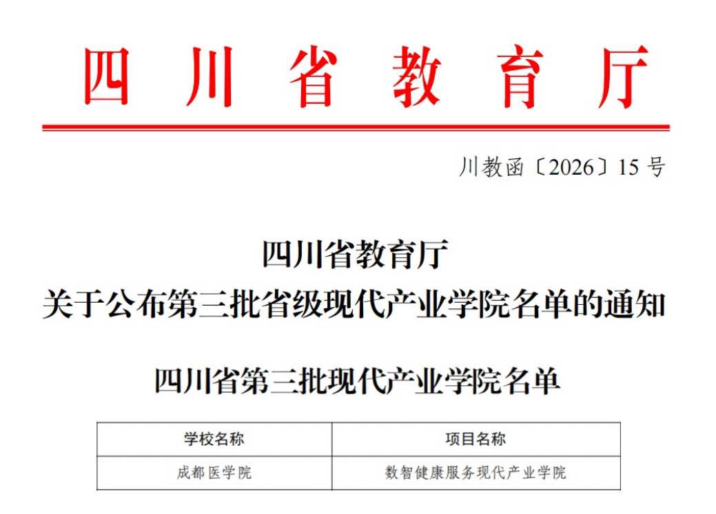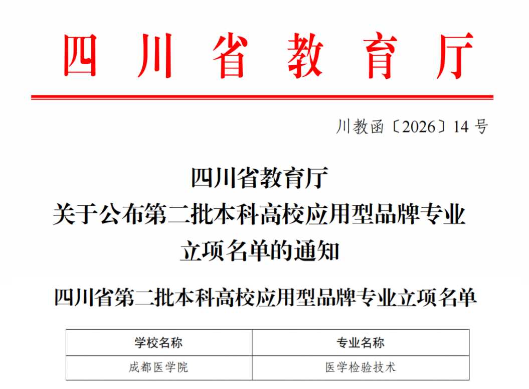 近日,四川省教育厅发布了《关于公布第三批省级现代产业学院名单的通知》(川教函〔2026〕15号)与《关于公布第二批本科高校应用型品牌专业立项名单的通知》(川教函〔2026〕14号)。学校组织申报的“数智健康服务现代产业学院”及“医学检验技术”专业成功入选。这是学校持续深化教育教学改革、推动产教融合的重要突破,标志着学校在服务区域产业发展、培养高素质应用型人才方面迈出坚实一步。