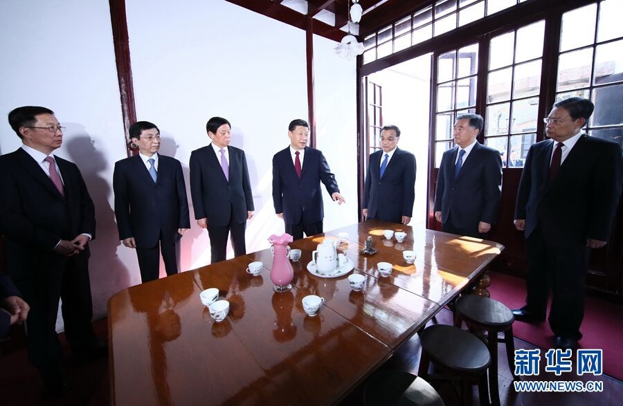 10月31日,中共中央总书记、国家主席、中央军委主席习近平带领中共中央政治局常委李克强、栗战书、汪洋、王沪宁、赵乐际、韩正,瞻仰上海中共一大会址和浙江嘉兴南湖红船。这是31日上午,习近平等在上海瞻仰中共一大会议室原址。新华社记者 兰红光 摄