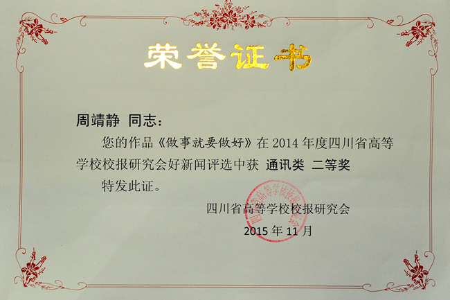 四川省高校校报研究会“2014年度好新闻奖”获奖作品共167件,其中一等奖35件,二等奖51件,三等奖81件。成都医学院5件作品获奖,王海川、孔孟雯、赵柯蕾、刘颢采写的《学校师生感恩致敬“无语老师”》获消息类二等奖,王海川作品《未来的人生已悄然开启》获言论类二等奖,周靖静作品《做事就要做好》获通讯类二等奖,王海川作品《榜样的力量》获版面类三等奖,王维、李承希作品《京剧走进校园 师生共享国粹》获图片类三等奖。