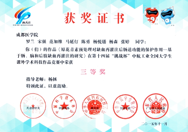 我校历来重视“挑战杯”学生课外学术科技创新创业比赛,希望通过比赛促进学生学术科研能力和创新创业实践能力的提高,学校通过政策扶持、制度激励等鼓励和支持全校学生积极参赛。在今年6月举行的“挑战杯”省赛中我校学子荣获2个一等奖、3个二等奖、5个三等奖的优异成绩。学校对这一系列成绩表示肯定,同时提出要积极备战国赛。之后,杨拯老师带领学生团队继续备赛,对获得省一等奖《原花青素预处理对缺血再灌注后肠道功能的保护作用——基于肠、脑和后肢缺血再灌注的研究》论文进行再完善,最终取得全国三等奖的成绩。同时,罗兰同学的论文《那些挥洒在实验室的无悔青春》经大会组委会审查后,入选在香港举行的国际大学生创新创业峰会进行学习交流。