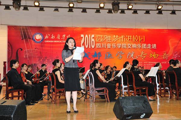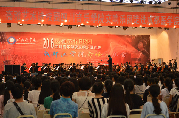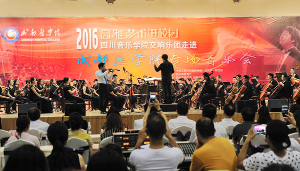 6月2日晚7时30分,由国家教育部、文化部、财政部主办的高雅艺术进校园——四川音乐学院交响乐团走进成都医学院专场音乐会在我校新都校区蜂巢体育馆隆重举行。校党委书记凌保东、校长余小平、副校长郝明出席活动,四川音乐学院党委书记、校长林戈尔、党委副书记候钫莅临活动现场。全校1500余名师生一起聆听了这场音乐盛宴。