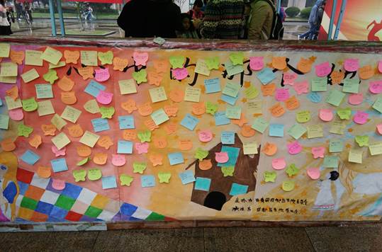 活动过程中,主办学生首先通过发传单、做宣传口号等形式,号召同学们大胆在公共展板上留言,并写出自己的心声。留言内容以“心中的她”为主题,男同学写下自己心中所期待的“她”的样子,女同学则写下对自己未来的期望和目标。活动吸引了大量的学生驻足观看,并积极踊跃的参与,在较短时间内整个留言墙就贴满了各式各样的心愿小卡。