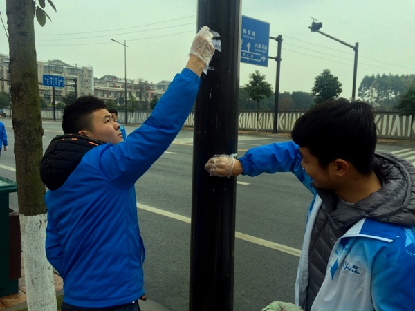 此次活动由预备党员带领大一团员共23名志愿者参加,通过徒步行环绕学校周边街道,采取捡垃圾、清理公共设施牛皮鲜广告等形式,身体力行雷锋精神。上午九点,全体志愿者于学校侧门集合后便开始了拾起身边垃圾,营造干净环境的征程。同学们从学校侧门出发,手拿垃圾袋,按桂林小学—正兴小区—学校大门的路线,一路“火眼金睛”,不放过每个死角,将一个个的垃圾放入垃圾袋。活动过程中下起了绵绵细雨,春寒春雨夹杂的丝丝凉意,并未削志愿者们浓浓热情,没有人抱怨,大家不嫌脏,不嫌累,保持极高劳动热情。通过“严厉行军”,贴在公物上的小广告不见了,藏在草丛中的烟头也没有逃过同学们的“如来神掌”,油腻的食品袋,散落的水果皮……一个个“四海八荒的妖魔鬼怪”都被英勇细心的“战士们”装进了“东皇钟”。
