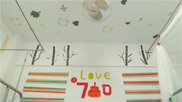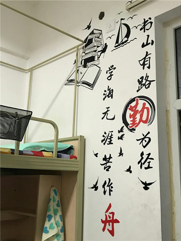 男生寝室虽然没有女生寝室的华丽温馨,但也有属于自己的特色。床边挂着的五星红旗彰显了他们的爱国之心,墙上写着的诗句是他们激励自己的话语。同学们的精神风貌通过寝室的建设展现出来,也将喜迎校庆的主题表现得淋漓尽致。