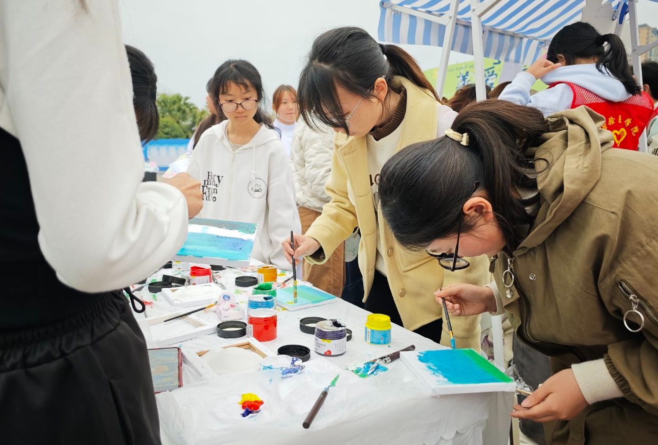 游园会现场设置丰富多元的体验项目,兼具趣味性与疗愈性,共设有情绪面具制作、风铃DIY、干花书签创作、情绪石头画等6项手工疗愈项目,以及盲盒传情、蒙眼大作战等4项趣味互动环节。活动中,同学们在绘画疗愈区用色彩释放情绪、表达心声;在风铃制作区写下心愿与期许;在干花书签摊位定格春日景致。大家围坐交流、携手创作,在指尖创作中与自我对话,在互动陪伴中悦纳自我。