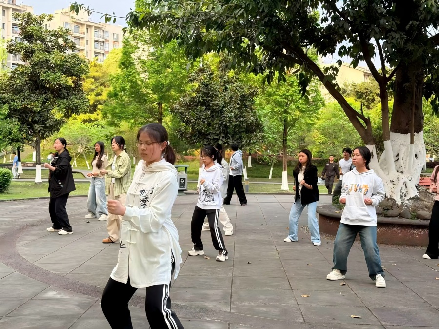 每场活动中,教学志愿者从基础站姿、呼吸调节入手,带领大家逐步掌握动作要领。“两手托天理三焦,左右开弓似射雕……”伴随轻柔口令,同学们缓缓起势,动作由生疏渐入流畅。志愿者一边示范,一边讲解“形神兼备、动静相兼”等核心要点,引导大家在一呼一吸间放松身心。