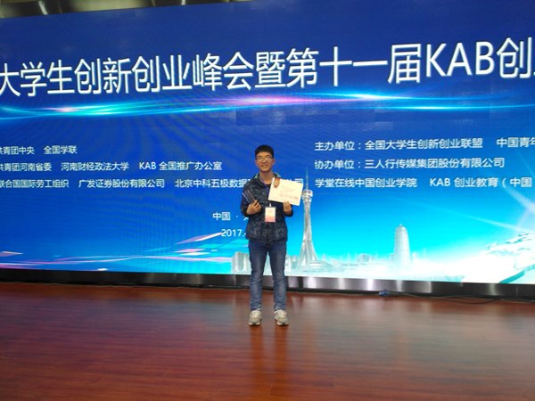 4月10日上午,在2017年全国大学生创新创业峰会2017年全国大学生创新创业峰会暨第十一届KAB创业教育年会上, 生物医学系2015级生物技术本科班学生杨政获评2016年“大学生创业英雄”100强。