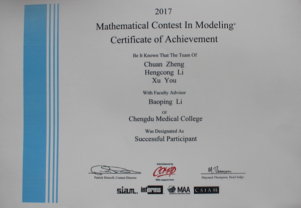 近日,2017年美国大学生数学建模竞赛(MCM/ICM)成绩揭晓,成都医学院人文信息管理学院2015级信息管理与信息系统专业的学生郑川、李恒聪、游徐团队在李宝平老师的指导下获得国际三等奖。