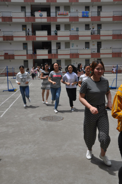 演练中,随着总指挥一声令下,学生公寓内响起阵阵急促的防空警报,疏散引导组成员快速就位,同学们按照疏散路线指示图从公寓内逃出,有序地撤离到指定安全区域(篮球场、足球场),各院系安全专员迅速完成人员清点统计后,上报演练总指挥部。随后,各院系学生工作负责人对本院系学生进行安全宣讲,要求每名学生记住发生突发事件后,正确的逃生路线和集合地点。