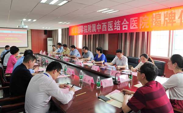 5月23日下午,成都医学院与成都市中西医结合医院共建“成都医学院附属中西医结合医院”揭牌仪式在行政楼第一会议室举行。学院党委书记余小平,党委副书记、院长樊均明,副院长潘克俭;成都市中西医结合医院院长徐荣华,副院长罗俊、傅红春、刘述益出席揭牌仪式。仪式由潘克俭主持。 余小平与徐荣华共同为“成都医学院附属中西医结合医院”揭牌。