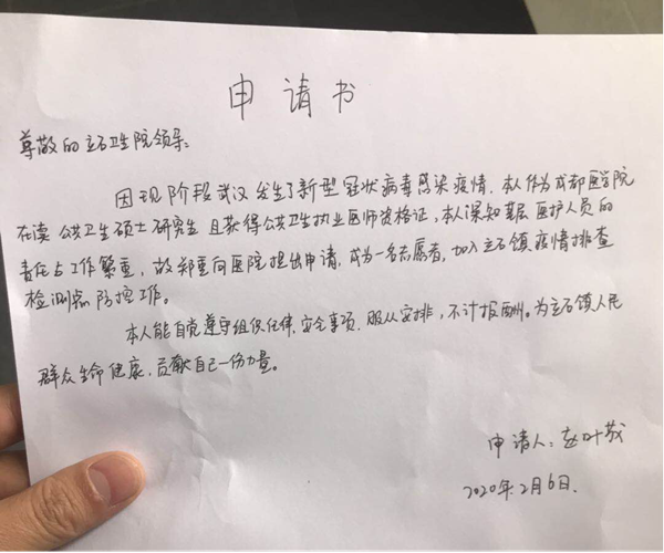“我叫赵叶茂,我是成都医学院公共卫生硕士专业学位的研究生,我已经获得了公卫职业医师资格证,我愿意去守护我身后故乡的每一个人。”2月6日,我将这样的申请书交到老家所在的泸州市泸县立石镇中心卫生院。面对如此这样重大的疫情,那些一个个逆行医护人员的背影,都鼓舞着我,让我渴望参与到其中。