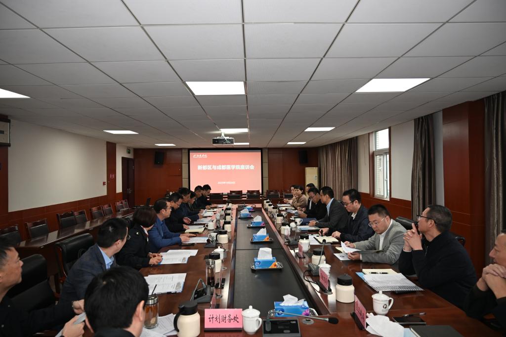 来建感谢新都区委、区政府长期以来对学校发展给予的关心和帮助。他表示,近年来在新都区的大力支持下,学校办学条件显著提升,周边环境持续优化,发展水平迈向新阶段。学校与新都区在经济社会发展上同向同行、协同共进,始终把服务地方区域卫生健康及社会经济发展视为学校高质量办学的责任与担当,希望以此次校地交流为契机,持续深化合作内容、拓展合作空间。