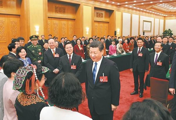 3月8日,中共中央总书记、国家主席、中央军委主席习近平参加十二届全国人大五次会议四川代表团的审议。这是习近平同女代表亲切交谈。 新华社记者 李学仁 摄