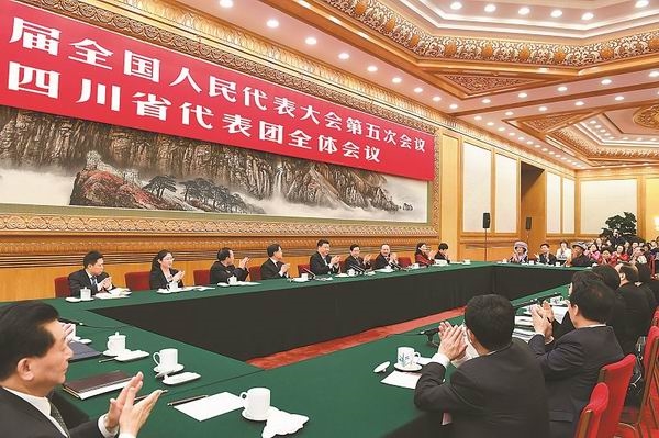 3月8日,中共中央总书记、国家主席、中央军委主席习近平参加十二届全国人大五次会议四川代表团的审议。 新华社记者 李学仁 摄