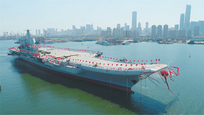 4月26日上午,我国第二艘航空母舰下水仪式在中国船舶重工集团公司大连造船厂举行。第二艘航空母舰由我国自行研制,2013年11月开工,2015年3月开始坞内建造。目前,航空母舰主船体完成建造,动力、电力等主要系统设备安装到位。出坞下水是航空母舰建设的重大节点之一,标志着我国自主设计建造航空母舰取得重大阶段性成果。下一步,该航空母舰将按计划进行系统设备调试和舾装施工,并全面开展系泊试验。图为航空母舰下水仪式现场。