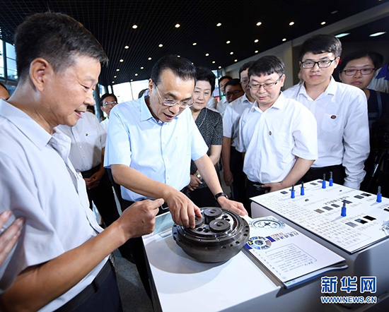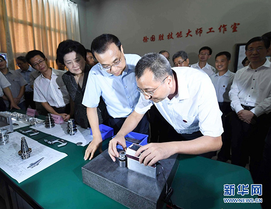 9月8日,在第三十三个教师节前夕,中共中央政治局常委、国务院总理李克强到天津职业技术师范大学考察现代职业教育发展情况并看望慰问师生,代表党中央、国务院向全国广大教师和教育工作者致以节日问候。这是李克强在天津职业技术师范大学国家级技能大师工作室查看超精密数控加工零件。新华社记者 张铎 摄