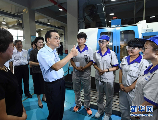 9月8日,在第三十三个教师节前夕,中共中央政治局常委、国务院总理李克强到天津职业技术师范大学考察现代职业教育发展情况并看望慰问师生,代表党中央、国务院向全国广大教师和教育工作者致以节日问候。这是李克强在天津职业技术师范大学数控模拟生产线边同学生们交流。新华社记者 张铎 摄