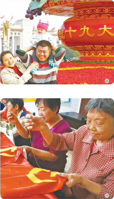 | 图②:游客在天安门广场的喜迎十九大花篮前合影。 图③:江苏省连云港市的党员用手绣党旗的方式喜迎十九大。 人民视觉 |